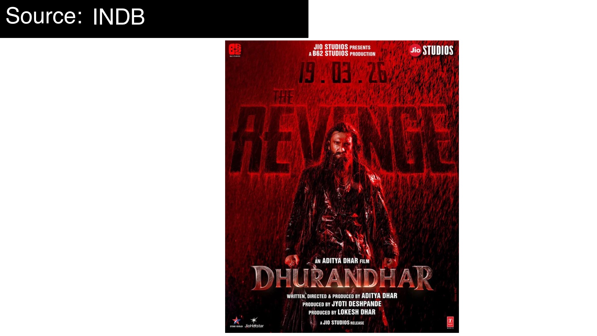 Director: Aditya Dhar | Cast: Ranveer Singh, R. Madhavan, Arjun Rampal, Sanjay Dutt, Sara Arjun, Rakesh Bedi, Danish Pandor, Gaurav Gera, Manav Gohil | Cameos: Yami Gautam, Akshaye Khanna | Cinematography: Vikash Nowlakha | Editing: Shivkumar V. Panicker | Music: Shashwat Sachdev | Production: Jio Studios / B62 Studios | Genre: Spy Action / Thriller | Runtime: 229 mins | Released: March 19, 2026